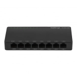Commutateur LANBERG gigabit 8 ports compact et silencieux pour la maison, SOHO et petites entreprises, offrant une installation Plug & Play, des ports RJ-45 10/100/1000 Mb/s avec MDI/MDIX, un débit de 16 Gbps et une alimentation 12 V pratique, compatible avec la vidéosurveillance, les alarmes et les alimentations de secours.