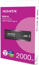 L'ADATA SC610 est un disque SSD externe compact et portable avec une haute capacité de 2000 GB. Avec le support de l'USB 3.2 Gen2, il atteint un débit allant jusqu'à 10 Gb par seconde, permettant des transferts de données rapides et efficaces.