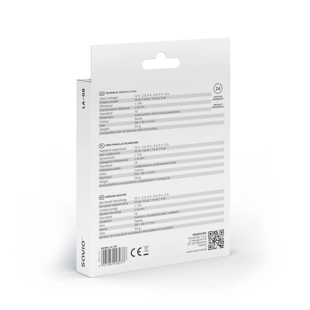 Le chargeur sans fil Savio 15W assure une recharge rapide et pratique pour une large gamme d’appareils comme les smartphones, montres connectées ou écouteurs sans fil. Grâce au standard Qi et à la prise en charge de technologies telles que Qualcomm Quick Charge et Power Delivery, il s’adapte facilement à tous vos besoins.