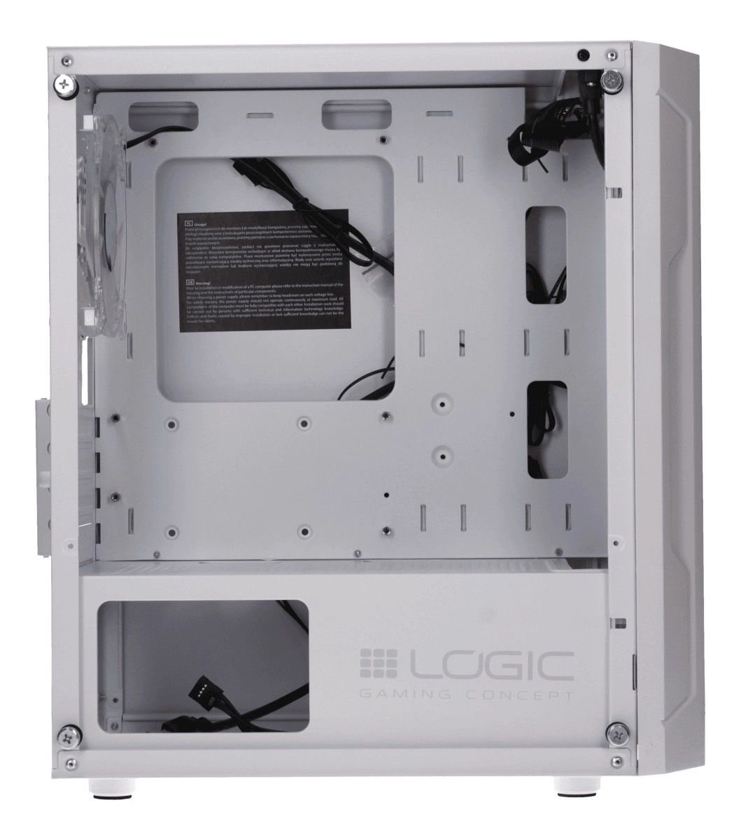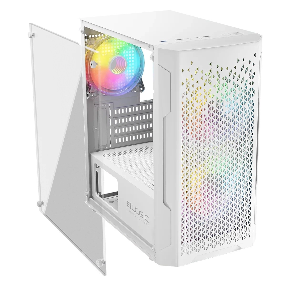 Le LOGIC Aramis ARGB Mini en élégant blanc combine design moderne et flux d’air étudié. Le panneau avant à motif mesh laisse entrer suffisamment d’air, tandis que deux ventilateurs ARGB 120 mm préinstallés gardent les composants au frais et apportent du style. Le panneau latéral en verre trempé met en avant votre carte graphique et les éléments éclairés; l’éclairage se change facilement via le bouton RESET sur le dessus.
