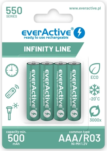 Ces accus AAA (R03) de 550 mAh sont livrés préchargés grâce à la technologie prêtes à l’emploi, vous pouvez donc les insérer immédiatement dans vos appareils. La gamme Infinity Line est conçue pour une longue endurance dans les appareils à consommation modérée, offrant ainsi un fonctionnement fiable et durable.