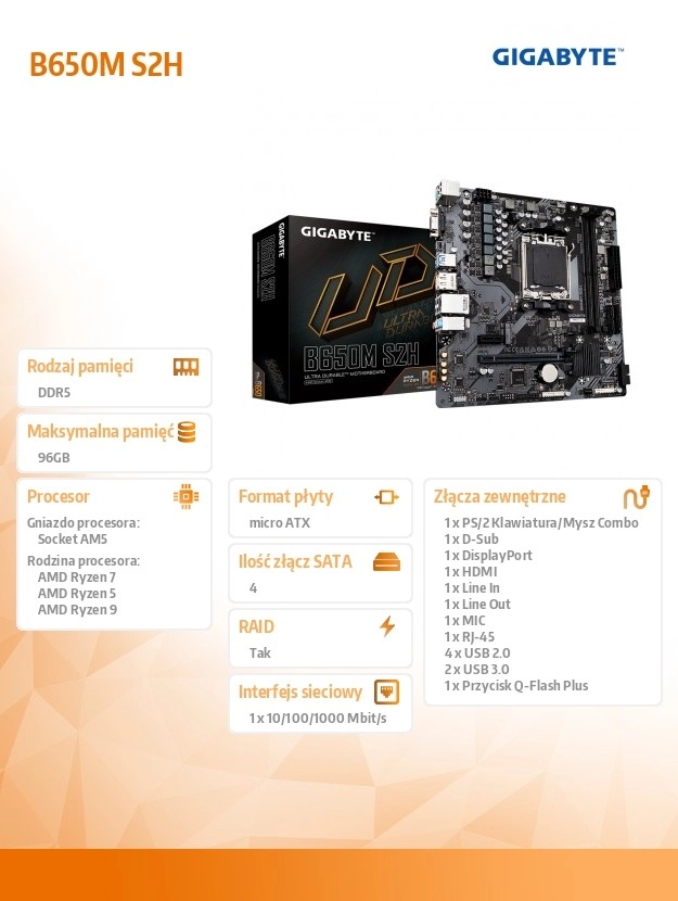 La GIGABYTE B650M S2H est une base fiable pour un PC moderne sur plateforme AMD AM5. Elle combine performances et efficacité grâce au VRM numérique, prend en charge la DDR5 double canal et permet des débits élevés via le slot M.2 PCIe 4.0 x4. Des composants audio de qualité et des circuits sonores isolés garantissent une écoute propre.