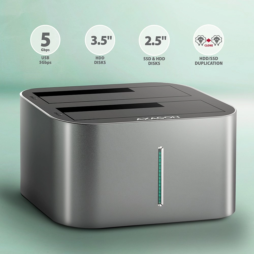 Station d’accueil universelle AXAGON pour deux disques 2,5"/3,5" offrant une connexion rapide via USB‑C 5 Gb/s, la prise en charge SATA 6 Gb/s avec UASP et un clonage hors ligne pratique sans ordinateur. Profitez des performances complètes des SSD, de la fonction TRIM, de la lecture S.M.A.R.T. et de la mise en veille automatique. Boîtier en aluminium stable, voyants LED et câble USB‑C–USB‑A inclus pour une utilisation simple et fiable.