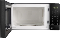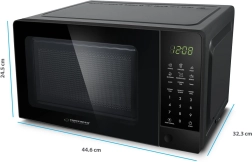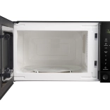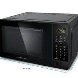 Le four à micro-ondes présente un design noir élégant, un panneau de commande numérique et un affichage pour régler facilement des fonctions telles que la cuisson, la décongélation et le réchauffage.