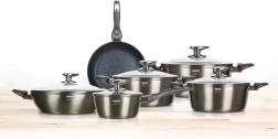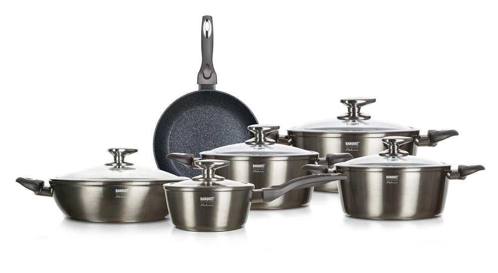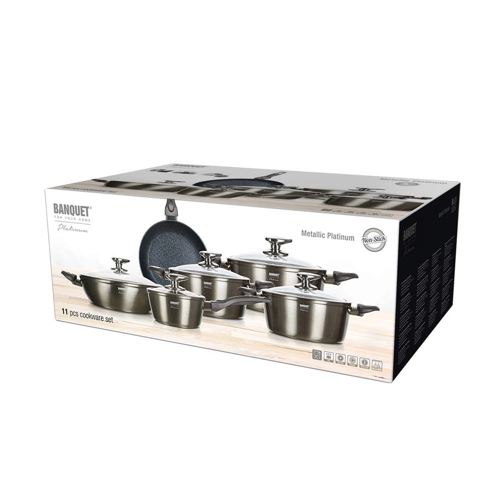 Ensemble de fonderies en aluminium METALLIC PLATINUM, 11 pièces. Contenu : faitout avec couvercle en verre 16 cm, 1. casserole avec couvercle en verre 16 cm, 2. casserole avec couvercle en verre 16 cm, 3. casserole avec couvercle en verre 16 cm, casserole 20 cm, 2,2 l, casserole 24 cm, 4,2 l, casserole 28 cm, 6,7 l, avec couvercles en verre et boutons en inox, sauteuse basse avec couvercle en verre 28 x 7,5 cm, 3,7 l, poêle 26 cm, douche métallique carbone extérieure, épaisseur de paroi 3 mm, fond entièrement induction, poignée soft touch. Le revêtement antiadhésif est très dur et résistant aux rayures. Les produits sont résistants aux chocs et à la déformation. La haute conductivité thermique assure une cuisson rapide et économique – conserve la chaleur longtemps.