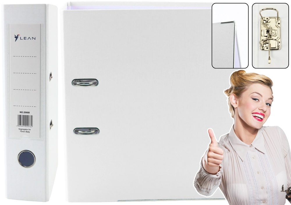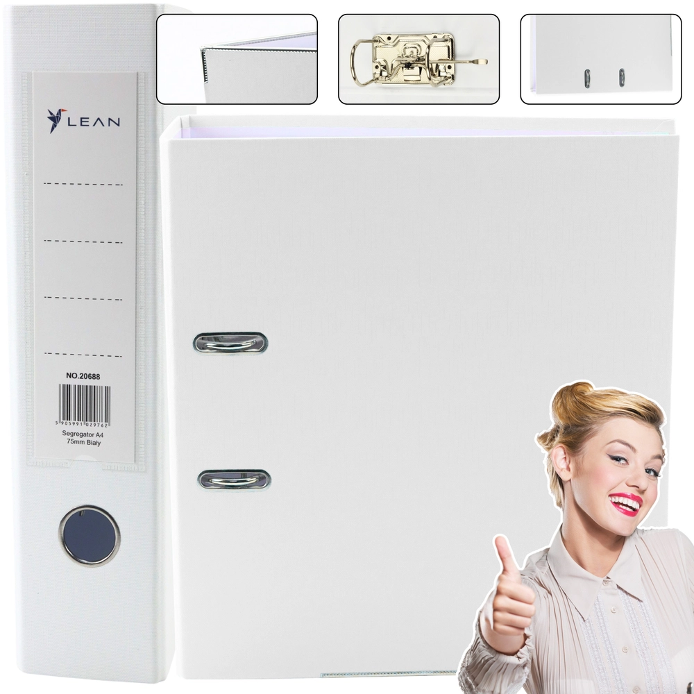 Élégant classeur pour documents A4 avec dos large de 75 mm, dans un blanc pur. Idéal pour le rangement des documents au bureau, à la maison ou pour le matériel scolaire. Peut contenir jusqu’à 500 feuilles 80 g/m², parfait pour archiver factures, contrats et autres documents importants.