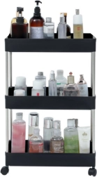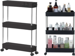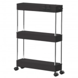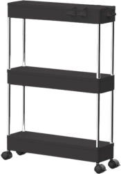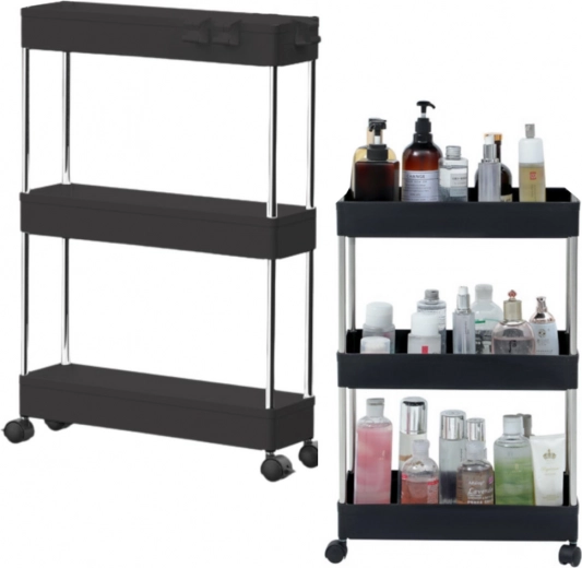 Étagère mobile pratique avec 3 niveaux en élégant coloris noir pour une organisation facile dans la cuisine, la salle de bain et le salon. Grâce à ses dimensions compactes, sa structure mobile sur roulettes et sa construction stable en métal et plastique résistant, elle permet de ranger clairement épices, cosmétiques, livres et décorations.