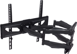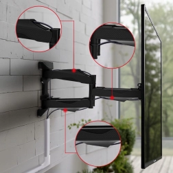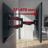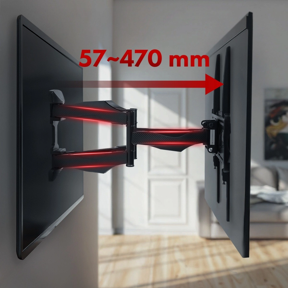 Ce support mural robuste permet d’installer confortablement votre téléviseur dans le salon, la chambre ou le bureau. Grâce au double bras articulé, vous pouvez éloigner la TV du mur de 57 à 470 mm, l’orienter selon l’angle souhaité et l’incliner dans une plage de +2° à -12° pour une visibilité parfaite sans reflets.