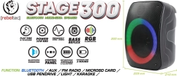 Haut-parleur Bluetooth portable Stage 300 offre une excellente expérience musicale où que vous soyez. Il se distingue par sa polyvalence, sa puissance sonore et son éclairage RGB multicolore.