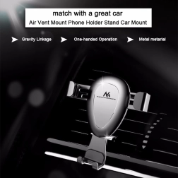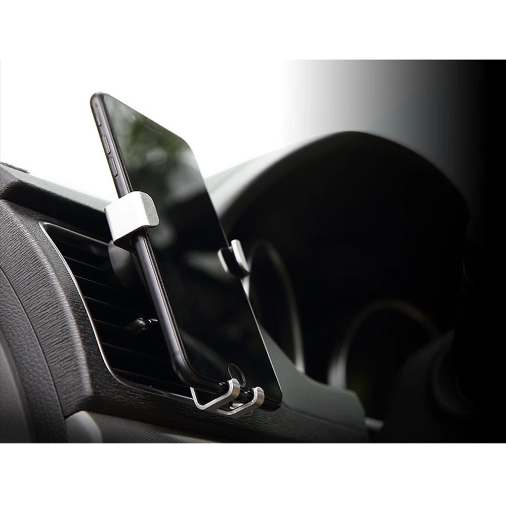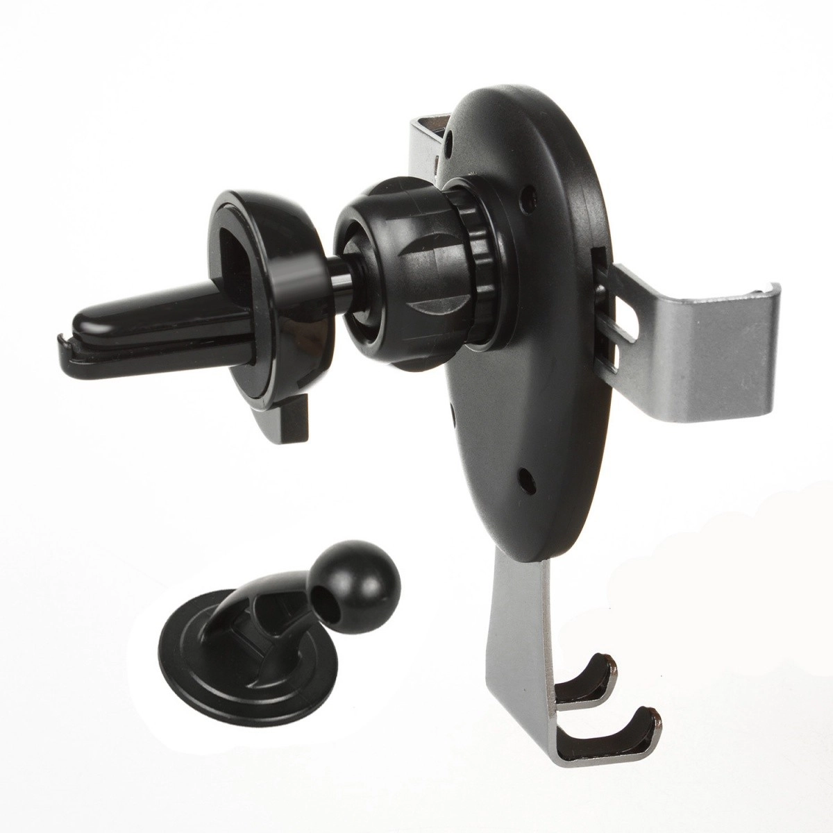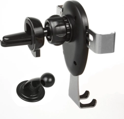 Support gravitationnel pour appareils mobiles, à fixer sur la grille d’aération ou le pare-brise. Il suffit d’y placer le téléphone ou smartphone et les mâchoires se ferment automatiquement. Il est équipé d’une tête rotative permettant d’orienter le téléphone sous n’importe quel angle. Un socle est également inclus pour un montage, par exemple, sur le tableau de bord.