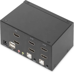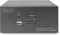 Le commutateur KVM compact DIGITUS vous permet de gérer confortablement deux ordinateurs tout en prenant en charge deux moniteurs externes via HDMI. Basculez entre les PC d’une simple pression sur un bouton ou via un raccourci clavier, sans avoir à rebrancher les câbles en permanence. Le commutateur achemine également l’audio (microphone/casque) et offre un port USB en façade pour connecter rapidement des clés USB ou d’autres périphériques.