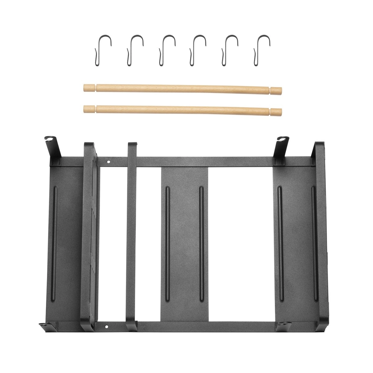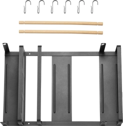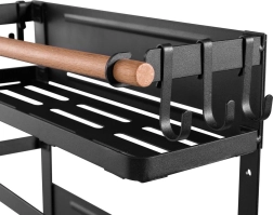 Le large porte-essuie-tout convient à la plupart des rouleaux du marché. Six crochets amovibles peuvent être utilisés, par exemple, pour suspendre des tasses à café, des tasses ou des accessoires de cuisine. Grâce à son design universel et élégant, l’étagère s’intègre facilement à l’intérieur de toute cuisine. L’élément en bois a non seulement une fonction décorative, mais protège également les produits placés contre les chutes. Trois aimants puissants permettent un montage facile et rapide de l’étagère sur une surface métallique, par exemple sur un réfrigérateur ou une machine à laver, sans perçage ni outils. La charge maximale est de 12 kg.