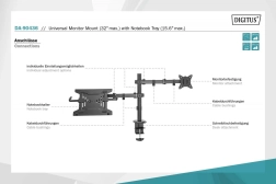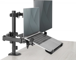 Le support permet un montage individuel, peu encombrant et ergonomique d’un moniteur jusqu’à 32''/9 kg et d’un ordinateur portable jusqu’à 15,6''/4 kg. Le support VESA est pris en charge. Le support offre deux options de montage : la pince de table et l’étrier passe-câble sont inclus. Grâce au système de fermeture rapide, la plaque VESA peut être fixée ou retirée à l’aide d’une vis lors du montage/démontage. Grâce au système intégré de gestion des câbles, le poste de travail reste ordonné.