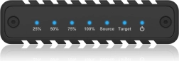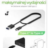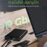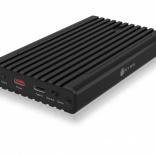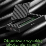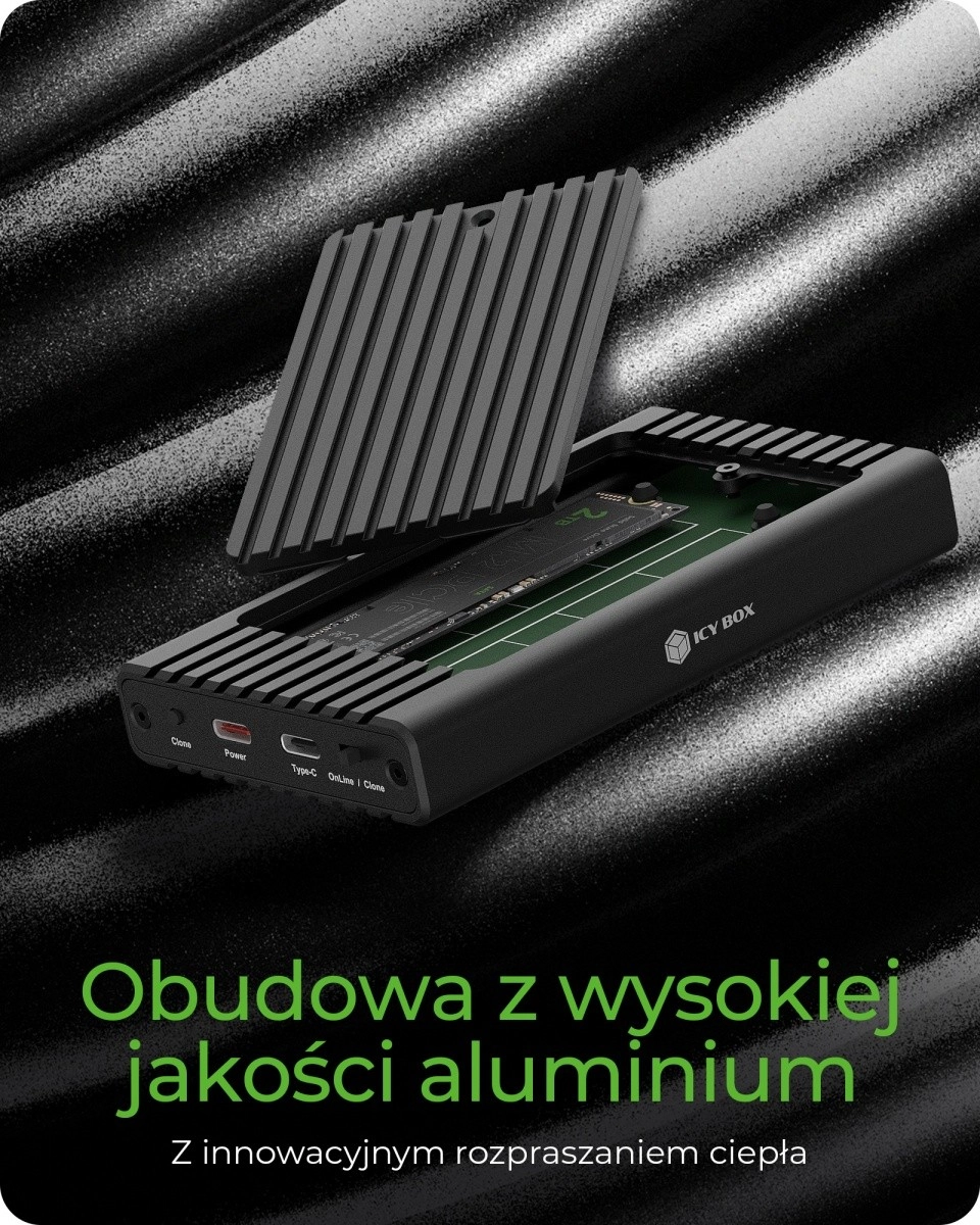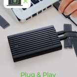 La conception tout aluminium avec ailettes de dissipation et pads thermiques sur le capot évacue efficacement la chaleur même sous charge prolongée. En plus du câble combiné USB‑C/USB‑A, il est possible de connecter une alimentation supplémentaire via USB‑C pour les SSD plus exigeants (adaptateur non inclus).