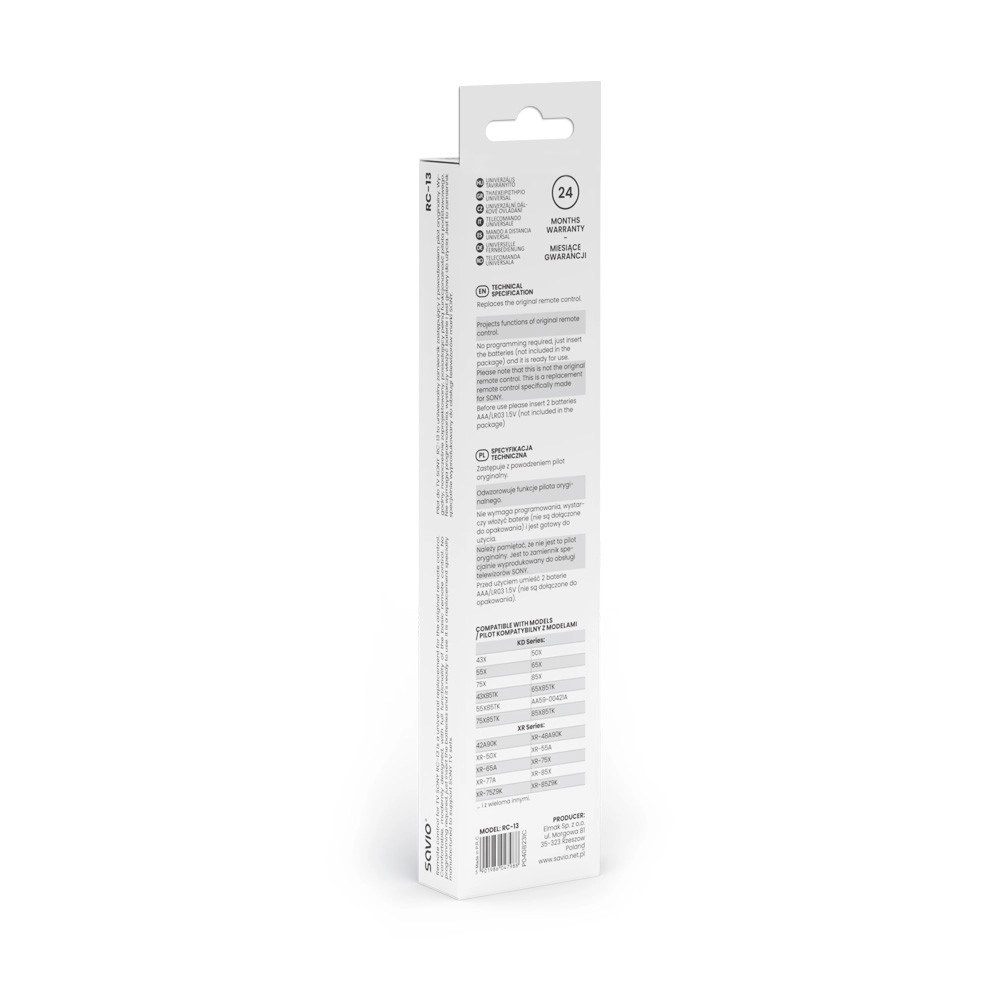 La télécommande Savio RC-13 est idéale pour ceux qui souhaitent contrôler facilement leur téléviseur Sony. Grâce à sa configuration prédéfinie et à sa simplicité d’utilisation, il suffit d’insérer deux piles AAA pour commencer à contrôler votre TV. Son design intuitif garantit un accès confortable à toutes les fonctions TV de base telles que le changement de chaîne, le réglage du volume ou la sélection de la source d’entrée.