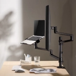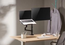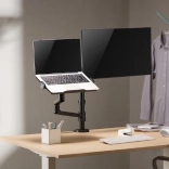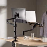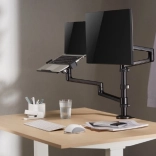 Un bras pour moniteur 17–32" (VESA 75×75/100×100), l’autre avec plateau pour ordinateur portable jusqu’à 17,3". Gagnez de la place et obtenez un poste parfaitement harmonisé.