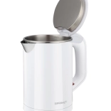 Le modèle SEK11, d’une capacité de 0,6 L, est idéal pour les petites cuisines ou les espaces minimalistes. Son élégant revêtement blanc s’intègre à tout intérieur où l’esthétique et la praticité sont essentielles. Avec une puissance maximale de 800 W, vous ferez rapidement chauffer l’eau pour le thé ou le café, ce qui est particulièrement important lors des matins pressés avant le travail ou l’école.