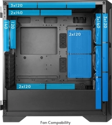 Le hub ARGB intégré permet de synchroniser l’éclairage avec votre carte mère (MB sync) et offre un réglage de la vitesse des ventilateurs pour un équilibre parfait entre performance de refroidissement et faible bruit. Grâce à son espace intérieur généreux, vous pouvez installer une configuration haut de gamme avec des cartes graphiques longues, des refroidisseurs tour imposants et un refroidissement liquide.