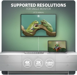 Grâce à l’interface rapide USB 3.2 Gen 1 (5 Gb/s), il gère sans problème deux disques externes simultanément, permet la charge d’un téléphone ou d’une tablette jusqu’à 1,5 A/5 V et prend en charge le HDR, les hautes fréquences de rafraîchissement (jusqu’à 2K/144 Hz, Full HD/240 Hz) ainsi que le HDCP 1.4–2.3. La construction en aluminium assure la robustesse et un refroidissement passif; les patins fournis permettent d’utiliser le hub comme support pour un meilleur refroidissement de l’ordinateur portable.