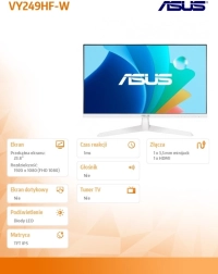 Le moniteur élégant ASUS VY249HF-W de 23,8" avec panneau IPS et un taux de rafraîchissement de 100 Hz offre une image fluide, de larges angles de vision et des couleurs fidèles pour le travail comme pour le divertissement. Grâce à la résolution Full HD et à son design moderne en blanc, c’est un excellent choix pour le bureau comme pour la maison.