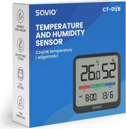 Le SAVIO CT-01 est un thermomètre et hygromètre numérique d'intérieur pratique avec un écran LCD clair affichant la température, l'humidité, l'heure et la date. Il dispose d'un indicateur de confort (Dry/Comfort/Wet), d'un support mural magnétique et d'une béquille rabattable pour une installation flexible à la maison comme au bureau.