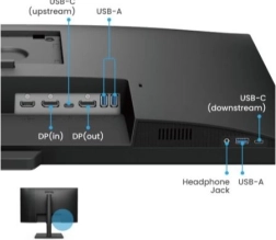 Conçu pour les longues sessions de travail, le pied ergonomique propose une inclinaison de -5° à 15°, une rotation ±20° et un pivot à 90° pour le mode portrait. La connectique complète inclut USB‑C, HDMI, DisplayPort (in/out) pour un branchement simple de plusieurs écrans, un hub USB‑A pour vos périphériques et une sortie casque.