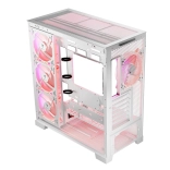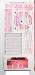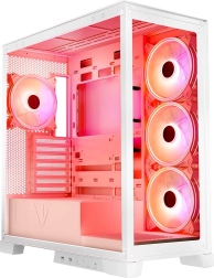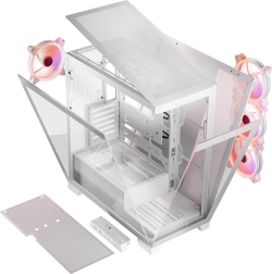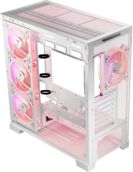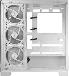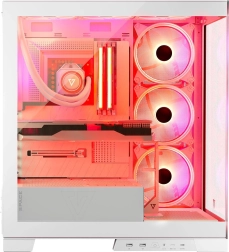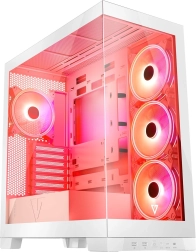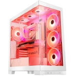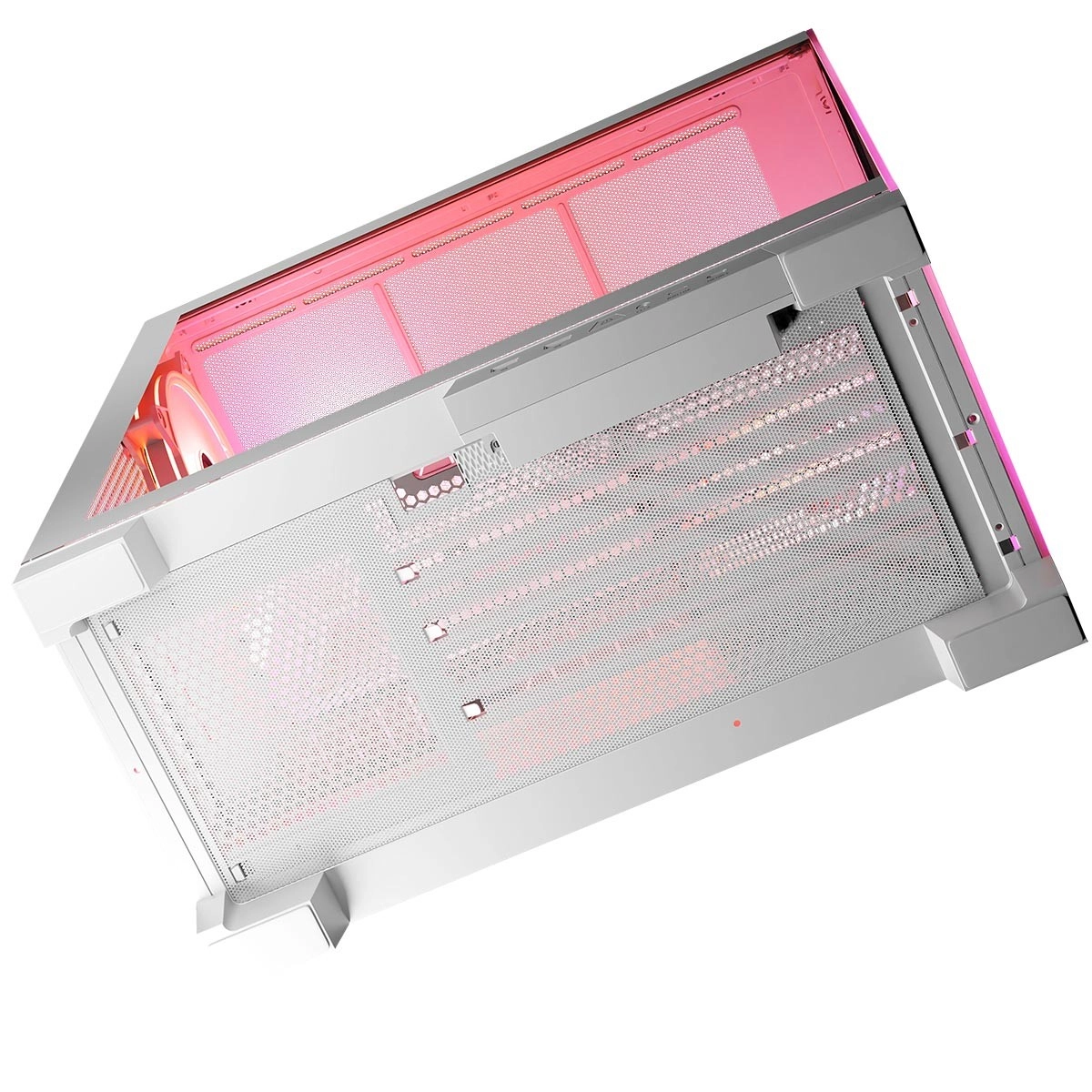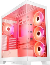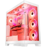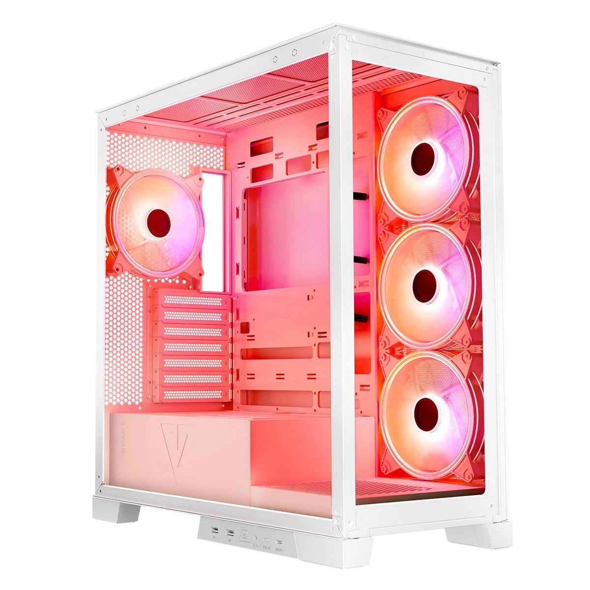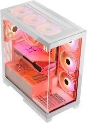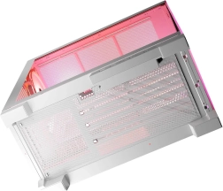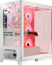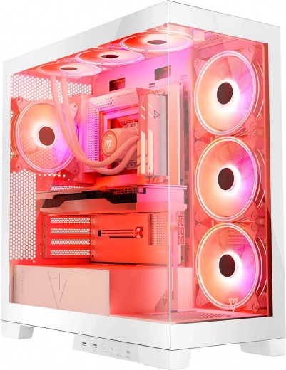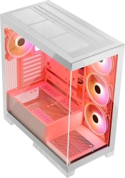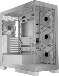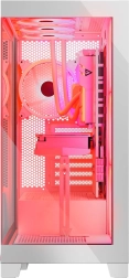 Volcano Space est un boîtier mid‑tower blanc, remarquable par son intérieur dégagé et son duo de panneaux en verre trempé. Sa conception permet d’installer des cartes mères ATX classiques ainsi que des modèles modernes à connecteurs déportés à l’arrière (p. ex. MSI Project Zero, ASUS B760M‑BTF). Vous dissimulez ainsi facilement le câblage et mettez pleinement en scène vos composants gaming.
