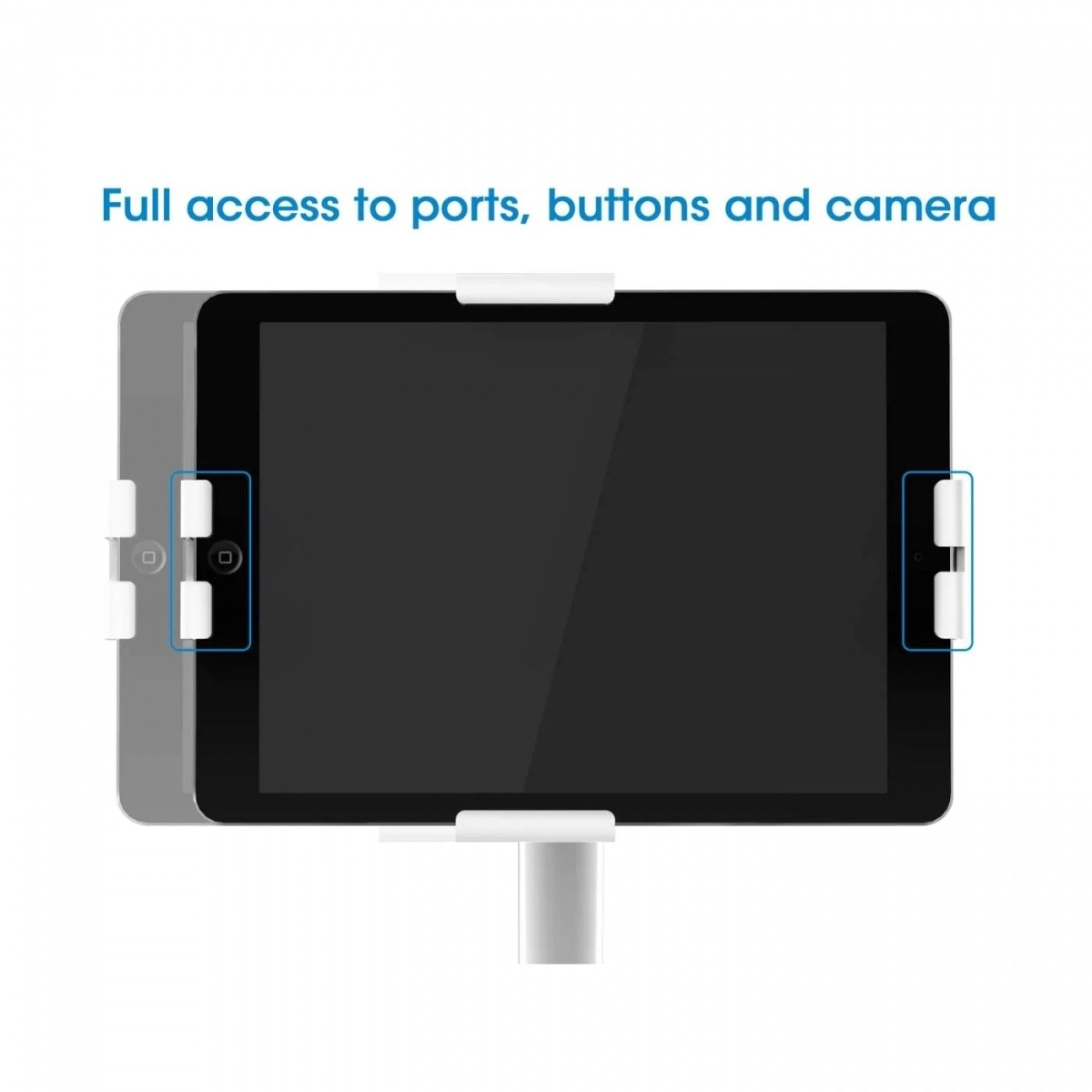 Des pinces réglables s’adaptent aux tablettes de toute marque avec diagonale de 7,9 à 11 pouces et maintiennent l’accès aux ports, boutons et caméras avant/arrière. Le dos doux et les coussinets en mousse fournis empêchent les rayures sur l’appareil.