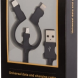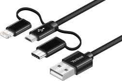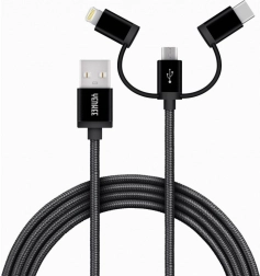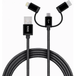 Le câble est équipé de trois connecteurs — USB‑C, Micro USB et Lightning — offrant une compatibilité avec divers appareils.