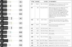 Comprend des embouts de M4 à M19 avec des spécifications détaillées telles que la tension et les modèles d'ordinateurs portables compatibles.