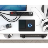 La conception soignée comprend un organisateur de câble au dos et des supports de montage pour une fixation au mur ou au meuble, à l’horizontale comme à la verticale. Les ports USB rétroéclairés facilitent le branchement dans la pénombre et la conformité EMC garantit que le chargeur n’interfère pas avec les autres appareils électroniques.