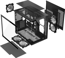 Possibilité de monter des cartes mères à connecteurs inversés. Conception vitrée à deux chambres. Design moderne.