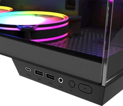 - Panneau E/S moderne : 2× USB 3.0, 1× USB‑C, combo audio et bouton de changement d’éclairage