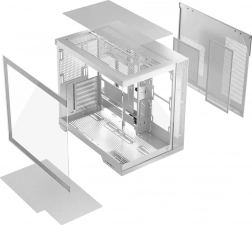 Boîtier blanc élégant avec verre trempé sur le côté et en façade, conception à deux chambres et prise en charge des cartes mères à connecteurs inversés. Il propose un USB‑C, de la place pour des radiateurs de 360 mm, des cartes graphiques jusqu’à 400 mm et un ventirad CPU de 175 mm. Inclus un contrôleur ARGB pour jusqu’à 9 ventilateurs; le boîtier est sans ventilateurs préinstallés pour configurer librement l’airflow.