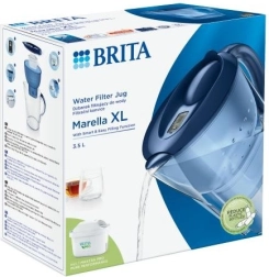La carafe BRITA Marella XL offre un volume total de 3,5 l et jusqu’à 2,0 l d’eau filtrée par remplissage. Grâce au couvercle à clapet, vous la remplissez d’une seule main ; le récipient passe au lave‑vaisselle (sauf le couvercle avec électronique) et ses dimensions lui permettent de se glisser dans la porte du réfrigérateur. L’indicateur électronique BRITA Memo rappelle le remplacement du filtre toutes les 4 semaines.