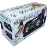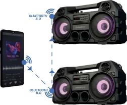L’enceinte offre une connectivité étendue : Bluetooth 5.0 pour le contrôle depuis un smartphone, radio FM, lecture depuis clé USB, carte microSD, entrée ligne AUX et mode karaoké. Le rétroéclairage RGB multicolore avec plusieurs modes peut être désactivé à tout moment ; s’ajoutent un écran LED clair, 8 boutons multimédias et 3 commandes rotatives pour un pilotage intuitif.