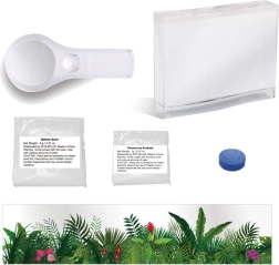 Le kit contient tout ce dont vous avez besoin pour commencer votre aventure: aquarium, gel nutritif, loupe, autocollant avec des plantes et manuel. Recommandé pour les enfants à partir de 8 ans.