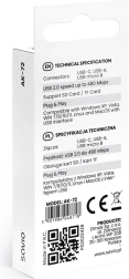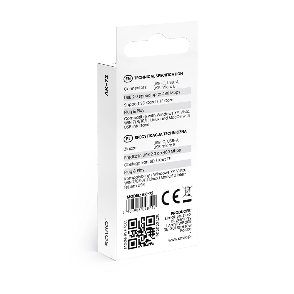 Le lecteur de cartes Savio 3-en-1 est l’appareil idéal pour les utilisateurs qui ont besoin de flexibilité et de rapidité lors de la gestion des données. Grâce aux connecteurs USB-C, USB-A et micro USB, il assure une connectivité polyvalente à une large gamme d’appareils, des ordinateurs portables modernes aux ordinateurs de bureau traditionnels. La prise en charge de l’interface USB 2.0 permet un transfert de données rapide jusqu’à 480 Mbps, garantissant un usage confortable.