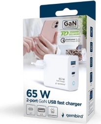 Chargeur secteur compact avec technologie GaN offrant une puissance de 65 W pour la charge rapide de votre téléphone, tablette et ordinateur portable. Grâce au duo de ports USB‑C et USB‑A, il prend en charge Power Delivery (PD) et Quick Charge 3.0, tandis qu’un indicateur LED pratique affiche l’état de l’alimentation.
