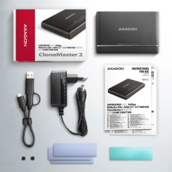 L’AXAGON CLONE MASTER 2 est une solution pratique pour la sauvegarde, la migration et le test de disques. Grâce à l’interface rapide USB 3.2 Gen 2 (10Gbps) et à un débit réel pouvant atteindre environ 1 000 Mo/s, il assure des transferts de données rapides. Insérez le disque NVMe M.2 sans vis, connectez les disques SATA 2,5"/3,5" directement au port SATA de l’adaptateur. Le sens du clonage se change par un commutateur entre NVMe M.2 → SATA et SATA → NVMe M.2.