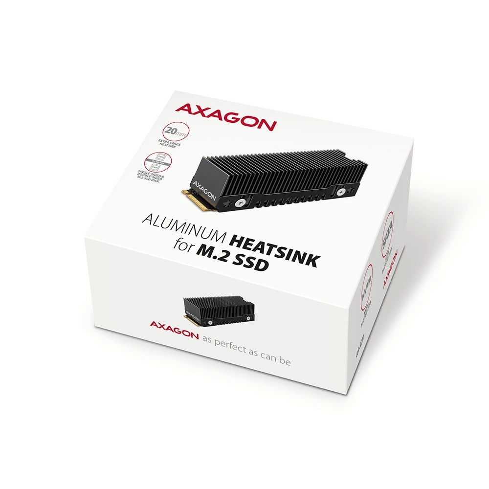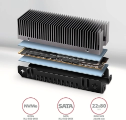 Le dissipateur est compatible avec les slots M.2 (NGFF) sur cartes mères ainsi qu’avec les adaptateurs, et prend en charge les modules SATA (AHCI) et NVMe (PCIe) au format 2280. Grâce à sa construction robuste et à sa large surface de contact, il peut abaisser la température jusqu’à 30 °C, ce qui élimine le thermal throttling, stabilise les vitesses et prolonge la durée de vie du SSD.