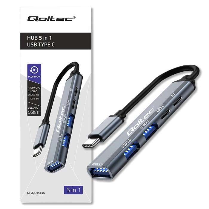 Le hub USB‑C 5‑en‑1 compact étend les ports de votre ordinateur portable ou tablette avec un USB‑C avec Power Delivery 3.0, un USB‑C supplémentaire, un USB 3.0 (5 Gb/s) et 2× USB 2.0. Il offre un transfert de données rapide et fiable, le Plug‑and‑Play sans pilotes et un boîtier en aluminium robuste au design élégant – idéal en déplacement comme au bureau.