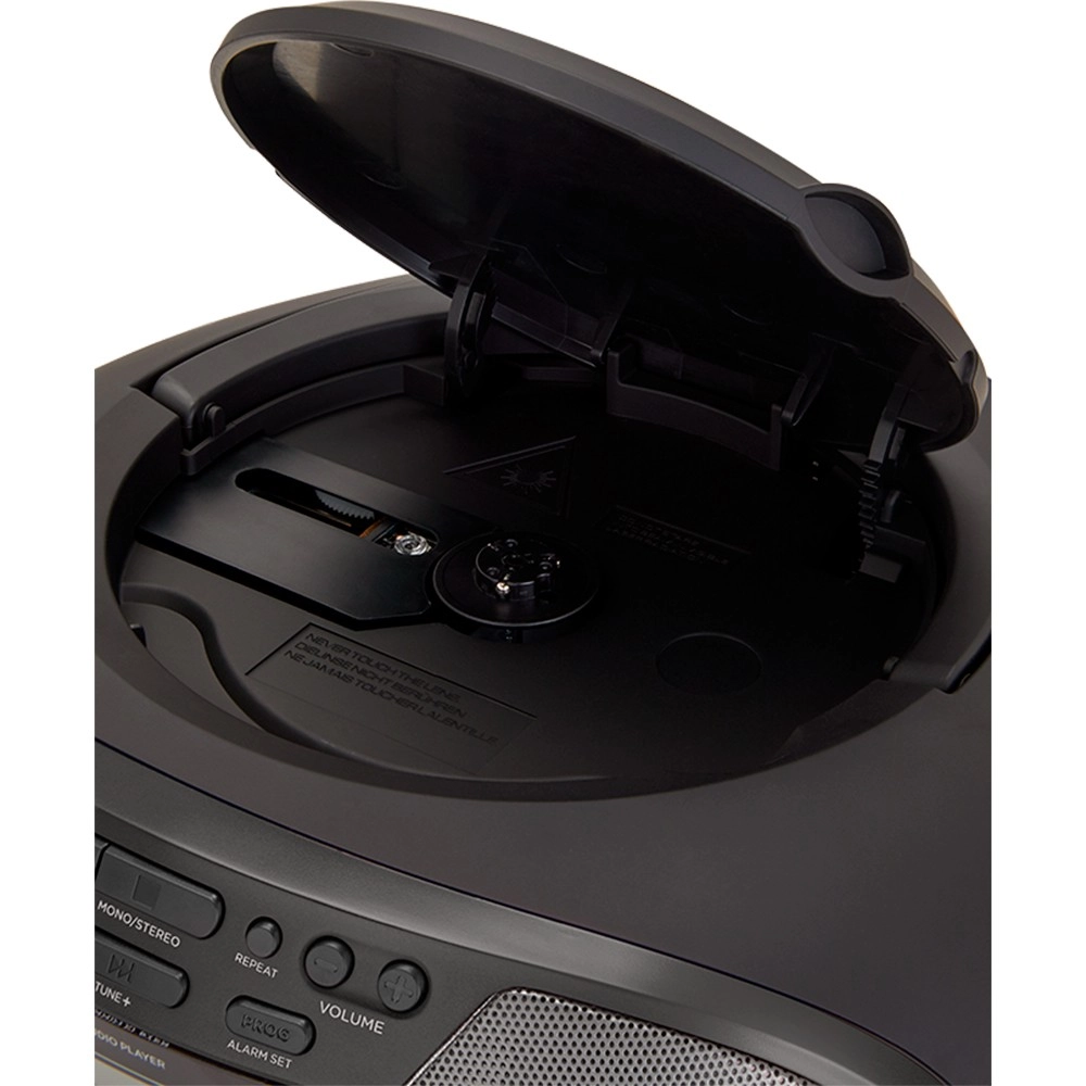 Ce boombox prend en charge la lecture des CD, CD-R, RW et MP3 avec possibilité de programmer les pistes. Avec la radio FM et ses 40 présélections, vous aurez toujours accès à vos stations préférées. Un grand écran LCD, une horloge numérique et une fonction réveil sont également au rendez-vous.