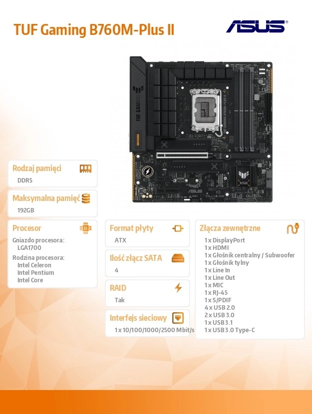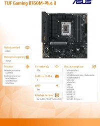 L’ASUS TUF Gaming B760M‑PLUS II exploite le potentiel des processeurs Intel pour socket LGA1700 et apporte un équilibre entre fonctionnalités gaming, durabilité et simplicité d’assemblage. Grâce à une alimentation renforcée, des dissipateurs de qualité et des tests de charge rigoureux, la carte est prête pour de longs marathons de jeu sans compromis sur la stabilité.