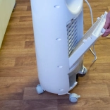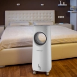 Contrairement à une climatisation classique, le refroidisseur est plus doux et plus économique. L’air passe à travers des filtres à eau qui le refroidissent ; pour un effet encore plus intense, il suffit d’ajouter des packs réfrigérants (inclus) dans le réservoir de 5 l. Lors du retrait ou de la vidange du réservoir, l’appareil se met automatiquement hors tension et le manque d’eau est signalé par un avertissement sonore.
