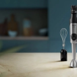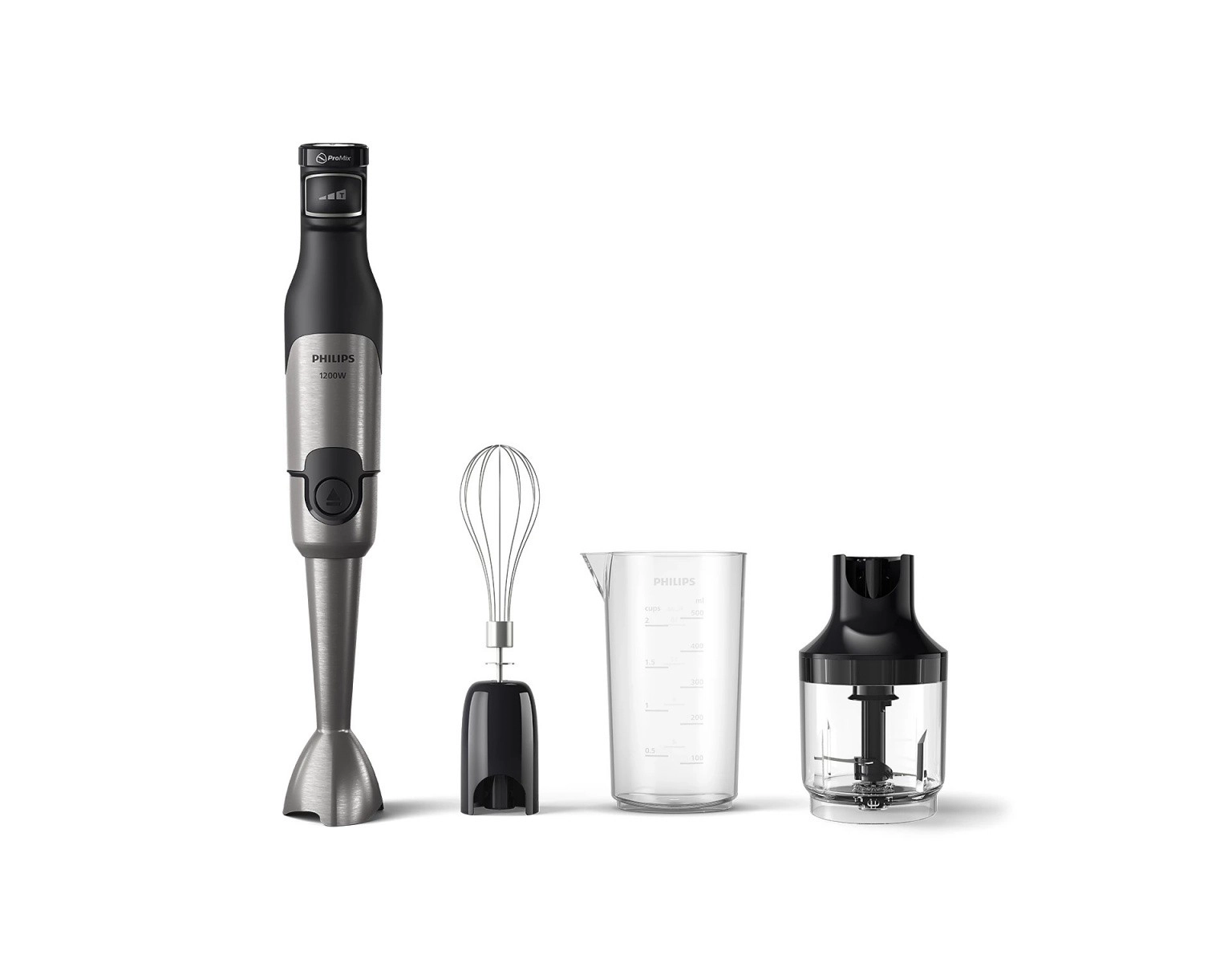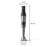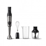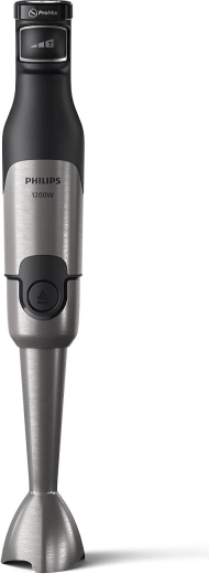 Puissant mixeur plongeant PHILIPS série 5000 avec une puissance de 1200 W, capable de traiter même les ingrédients les plus durs. Grâce à la technologie ProMix, il offre un mixage rapide et homogène sans éclaboussures, un contrôle fluide SpeedTouch et des accessoires pratiques incluant un hachoir 0,5 l, un fouet et un gobelet doseur.