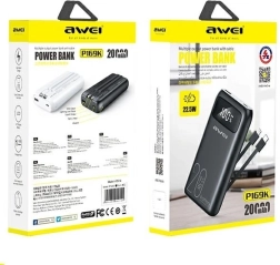 La batterie externe compacte AWEI P169K d’une capacité de 20000 mAh recharge en toute fiabilité votre téléphone et votre tablette même en déplacement. Elle offre la charge rapide 22,5 W, des connecteurs USB et USB‑C, des câbles intégrés USB‑C et Lightning, ainsi qu’un écran LCD affichant précisément l’énergie restante. Des protections de sécurité contre les surtensions et les courts‑circuits sont bien entendu présentes.