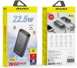 Batterie externe compacte Awei P13K avec une capacité de 20 000 mAh, offrant la charge rapide 22,5 W pour appareils iOS et Android. Grâce à 2× USB et USB‑C, elle peut alimenter plusieurs appareils simultanément et son grand écran numérique affiche clairement l’énergie restante – idéale en voyage comme pour les journées chargées.