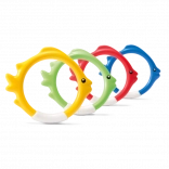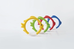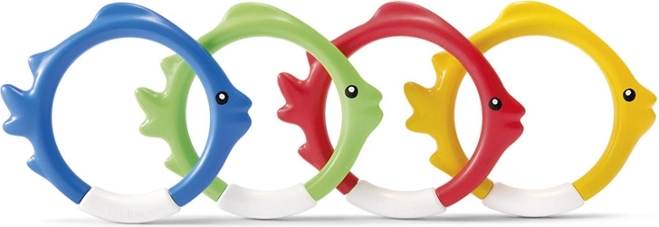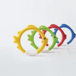 Ensemble ludique de quatre anneaux de plongée en forme de petits poissons pour enfants à partir de 6 ans. Les anneaux, en bleu, rouge, vert et jaune, se posent verticalement au fond lorsqu’on les jette dans l’eau, ce qui motive au travail de l’apnée et améliore les compétences de nage. Fabriqués dans un matériau souple et sûr pour une prise en main facile.