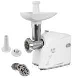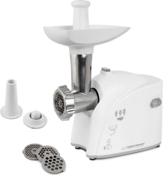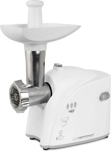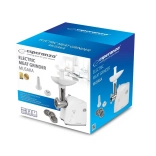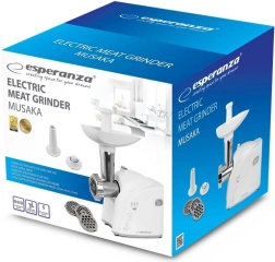 Puissant hachoir à viande électrique ESPERANZA Musaka offrant jusqu’à 2200 W pour un hachage rapide, 3 grilles interchangeables (3, 5 et 7 mm) pour différentes finesses et des accessoires pratiques pour saucisses et kebbe. La stabilité est assurée par des pieds antidérapants et le marche arrière facilite l’utilisation.